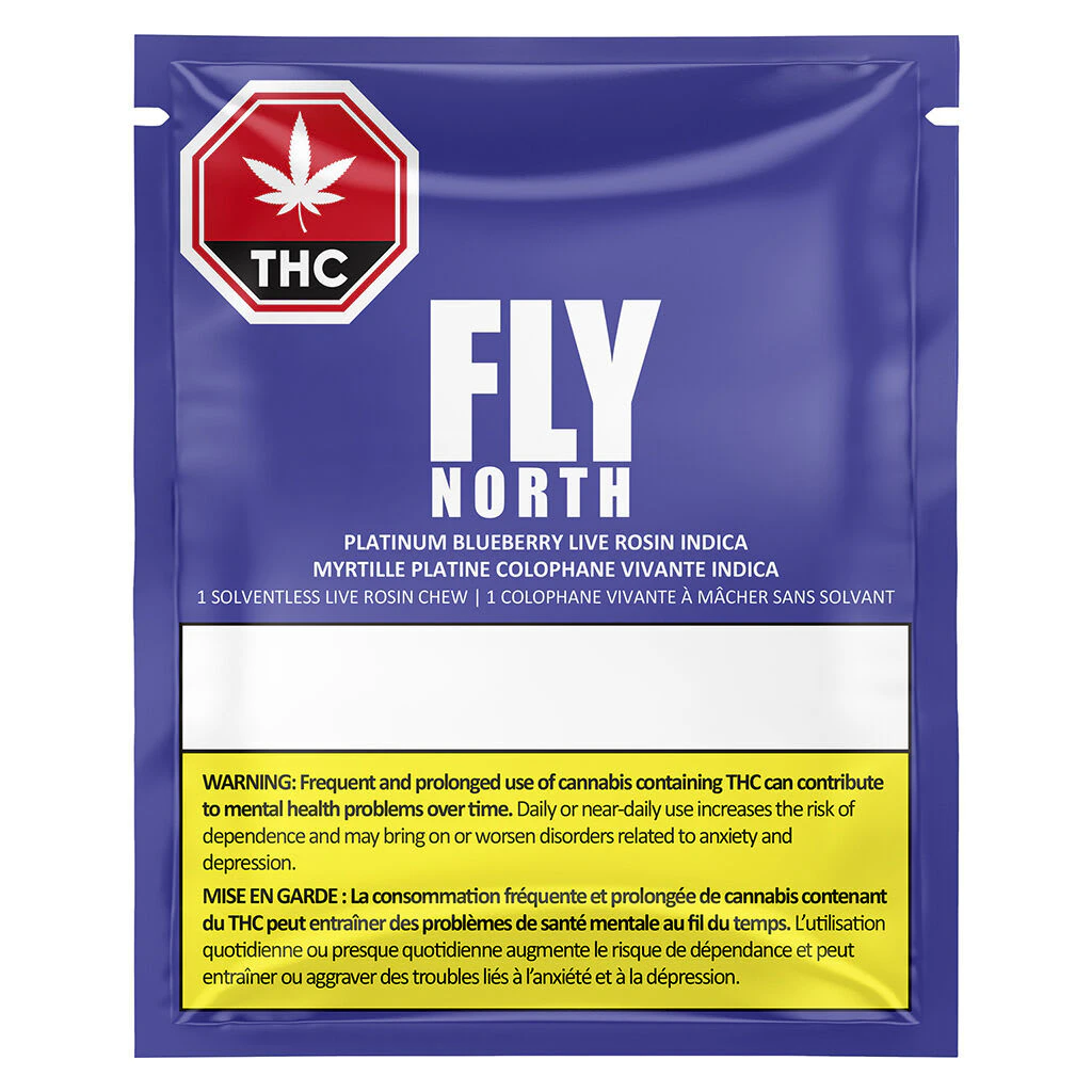 Fly North presents Platinum Blueberry Indica. This solventless live rosin soft chew contains natural flavour and natural colour, and is made without animal products or gluten. Pectin based. Top terpenes include farnesene, caryophyllene, humulene, limonene and ocimene.